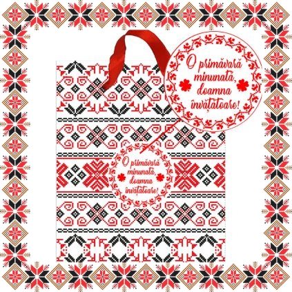 Punguta cadou de dimensiune 12x14.5x6cm cu design cu motive traditionale romanesti si mesajul O primavara minunata, doamna invatatoare! Daruieste cadoul tau complet de martisor!