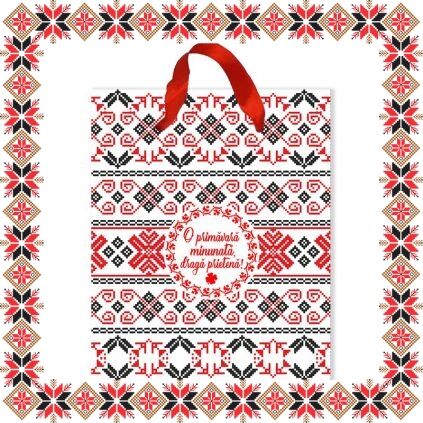 Punguta cadou de dimensiune 12x14.5x6cm cu design cu motive traditionale romanesti si mesajul O primavara minunata, draga prietena! Daruieste cadoul tau complet de martisor!