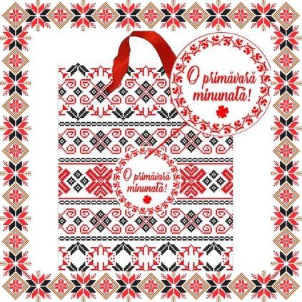 Punguta cadou de dimensiune 12x14.5x6cm cu design cu motive traditionale romanesti si mesajul O primavara minunata! Daruieste cadoul tau complet de martisor!