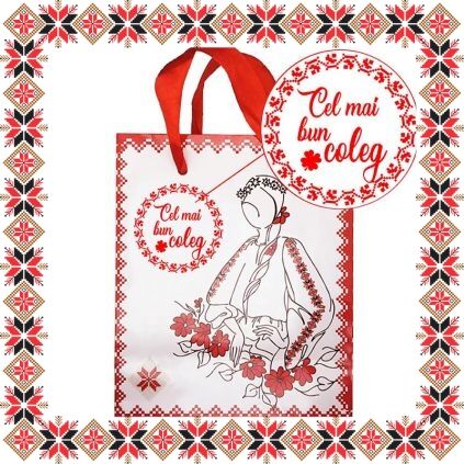 Punguta cadou de dimensiune 12x14.5x6cm cu doamna Primavara cu flori in par si ie traditionala, motive traditionale romanesti, trifoi cu patru foi si mesajul Cel mai bun coleg! Pe cealalta parte a pungutei vei regasi urarea O primavara minunata! Daruieste cadoul tau complet de martisor!