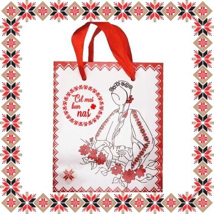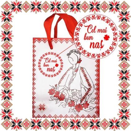 Punguta cadou de dimensiune 12x14.5x6cm cu doamna Primavara cu flori in par si ie traditionala, motive traditionale romanesti, trifoi cu patru foi si mesajul Cel mai bun nas! Pe cealalta parte a pungutei vei regasi urarea O primavara minunata! Daruieste cadoul tau complet de martisor!