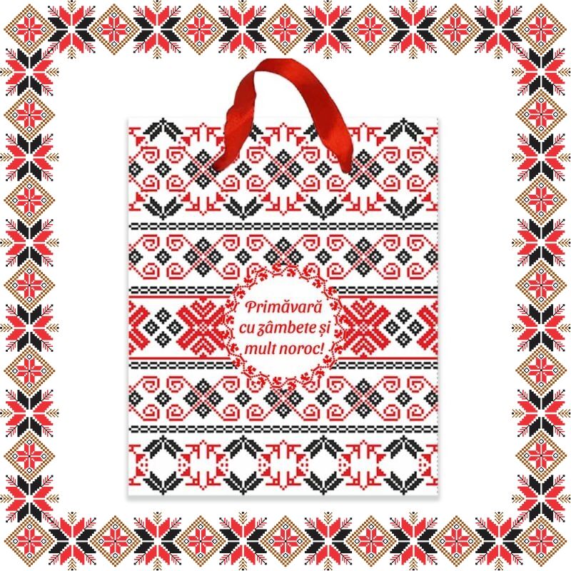 Punguta cadou cu dimensiune 12x14.5x6cm, imprimata cu motive traditionale romanesti si mesajul Primavara cu zambete si mult noroc! Daruieste cadoul tau complet de martisor!