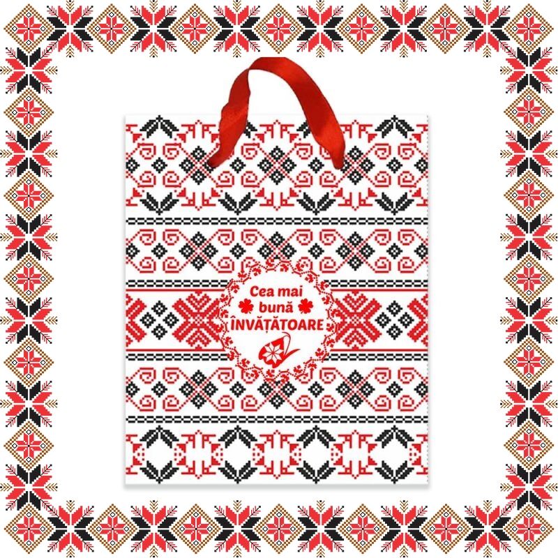 Punguta cadou cu dimensiune 12x14.5x6cm, imprimata cu motive traditionale romanesti si mesajul Cea mai buna invatatoare! Daruieste cadoul tau complet de martisor!