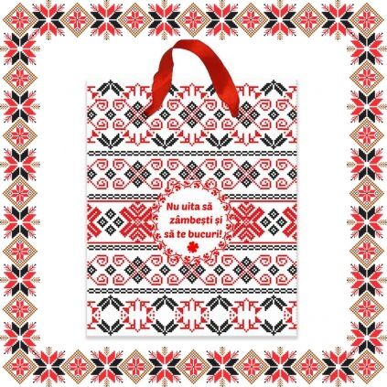 Punguta cadou cu dimensiune 12x14.5x6cm, imprimata cu motive traditionale romanesti si mesajul Nu uita sa zambesti si sa te bucuri! Daruieste cadoul tau complet de martisor!
