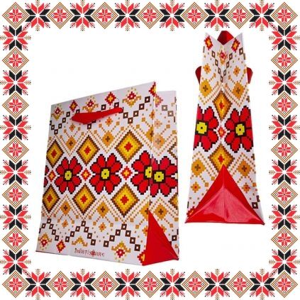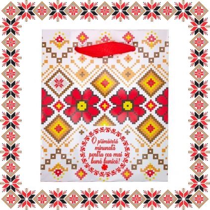 Punguta cadou cu dimensiune 12x14.5x6cm, imprimata cu motive traditionale flori si mesajul O primavara minunata pentru cea mai buna bunica! Daruieste cadoul tau complet de martisor!
