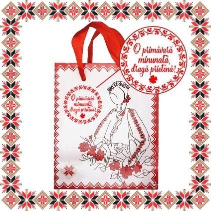 Punguta cadou de dimensiune 12x14.5x6cm cu doamna Primavara cu flori in par si ie traditionala, motive traditionale romanesti si urarea O primavara minunata, draga prietena! Pe cealalta parte a pungutei vei regasi urarea O primavara minunata! Daruieste cadoul tau complet de martisor!