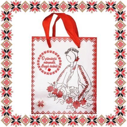 Punguta cadou de dimensiune 12x14.5x6cm cu doamna Primavara cu flori in par si ie traditionala, motive traditionale romanesti si urarea O primavara minunata, draga vecina! Daruieste cadoul tau complet de martisor!