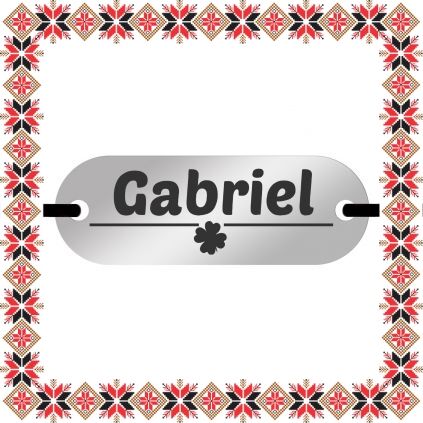 Bratara martisor personalizat prin gravarea pandantivului cu numele Gabriel si trifoi norocos cu patru foi. Pandantivul - placuta ovala este realizat din otel inoxidabil, un material rezistent ce nu isi modifica culoarea si aspectul in timp iar elasticul este de culoare neagra, aspect ce face din acest martisor un cadou ideal ce poate fi purtat tot anul fiind un accesoriu extrem de versatil, usor de asortat mai multor tinute vestimentare. Dimensiunea bratarii se poate regla prin cele doua noduri culisante, fiind potrivita pentru diferite circumferinte ale mainii. Gravam cu bucurie martisoare special create pentru oamenii dragi din viata ta!