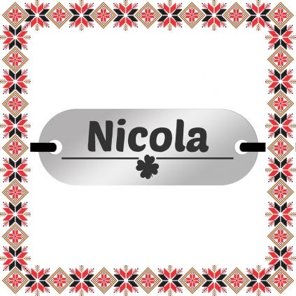 Bratara martisor personalizat prin gravarea pandantivului cu numele Nicola si trifoi norocos cu patru foi. Pandantivul - placuta ovala este realizat din otel inoxidabil, un material rezistent ce nu isi modifica culoarea si aspectul in timp iar elasticul este de culoare neagra, aspect ce face din acest martisor un cadou ideal ce poate fi purtat tot anul fiind un accesoriu extrem de versatil, usor de asortat mai multor tinute vestimentare. Dimensiunea bratarii se poate regla prin cele doua noduri culisante, fiind potrivita pentru diferite circumferinte ale mainii. Gravam cu bucurie martisoare special create pentru oamenii dragi din viata ta!