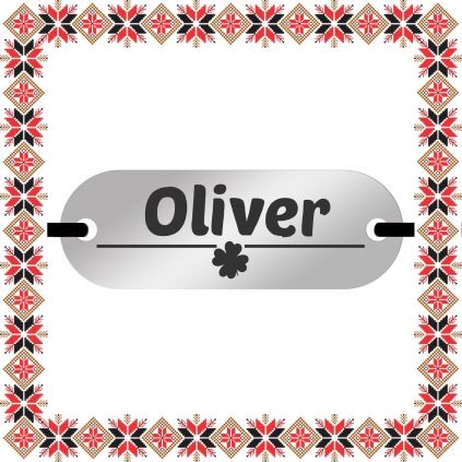 Bratara martisor personalizat prin gravarea pandantivului cu numele Oliver si trifoi norocos cu patru foi. Pandantivul - placuta ovala este realizat din otel inoxidabil, un material rezistent ce nu isi modifica culoarea si aspectul in timp iar elasticul este de culoare neagra, aspect ce face din acest martisor un accesoriu extrem de versatil, usor de asortat mai multor tinute vestimentare. Dimensiunea bratarii se poate regla prin cele doua noduri culisante, fiind potrivita pentru diferite circumferinte ale mainii. Gravam cu bucurie martisoare special create pentru oamenii dragi din viata ta!