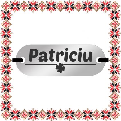 Bratara martisor personalizat prin gravarea pandantivului cu numele Patriciu si trifoi norocos cu patru foi. Pandantivul - placuta ovala este realizat din otel inoxidabil, un material rezistent ce nu isi modifica culoarea si aspectul in timp iar elasticul este de culoare neagra, aspect ce face din acest martisor un cadou ideal ce poate fi purtat tot anul fiind un accesoriu extrem de versatil, usor de asortat mai multor tinute vestimentare. Dimensiunea bratarii se poate regla prin cele doua noduri culisante, fiind potrivita pentru diferite circumferinte ale mainii.  Gravam cu bucurie martisoare special create pentru oamenii dragi din viata ta!
