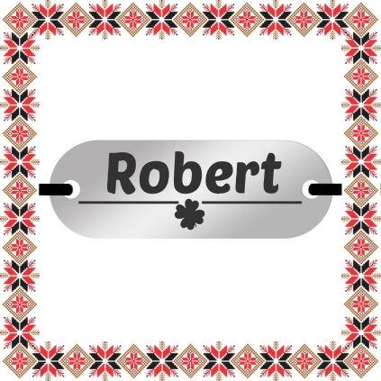 Bratara martisor personalizat prin gravarea pandantivului cu numele Robert si trifoi norocos cu patru foi. Pandantivul - placuta ovala este realizat din otel inoxidabil, un material rezistent ce nu isi modifica culoarea si aspectul in timp iar elasticul este de culoare neagra, aspect ce face din acest martisor un accesoriu extrem de versatil, usor de asortat mai multor tinute vestimentare. Dimensiunea bratarii se poate regla prin cele doua noduri culisante, fiind potrivita pentru diferite circumferinte ale mainii. Gravam cu bucurie martisoare special create pentru oamenii dragi din viata ta!
