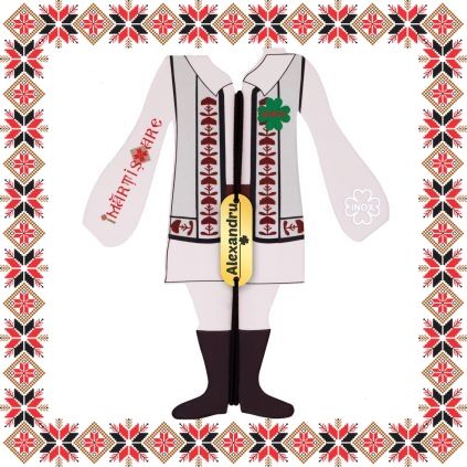 Martisor ambalat pe suport de carton de culoare bej in forma de costum popular romanesc cu motive traditionale.