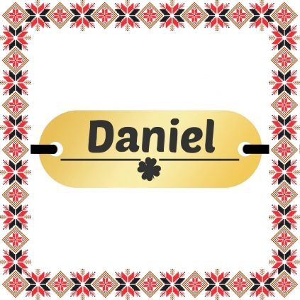 Bratara martisor personalizat prin gravarea pandantivului cu numele Daniel si trifoi norocos cu patru foi. Pandantivul - placuta ovala aurie este realizata din otel inoxidabil, un material rezistent ce nu isi modifica culoarea si aspectul in timp iar elasticul este de culoare neagra, aspect ce face din acest martisor un cadou ideal ce poate fi purtat tot anul fiind un accesoriu extrem de versatil, usor de asortat mai multor tinute vestimentare. Dimensiunea bratarii se poate regla prin cele doua noduri culisante, fiind potrivita pentru diferite circumferinte ale mainii. Gravam cu bucurie martisoare special create pentru oamenii dragi din viata ta!