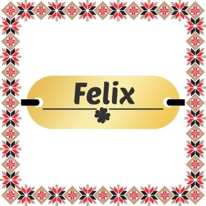 Bratara martisor personalizat prin gravarea pandantivului cu numele Felix si trifoi norocos cu patru foi. Pandantivul - placuta ovala aurie este realizat din otel inoxidabil, un material rezistent ce nu isi modifica culoarea si aspectul in timp iar elasticul este de culoare neagra, aspect ce face din acest martisor un accesoriu extrem de versatil, usor de asortat mai multor tinute vestimentare. Dimensiunea bratarii se poate regla prin cele doua noduri culisante, fiind potrivita pentru diferite circumferinte ale mainii. Gravam cu bucurie martisoare special create pentru oamenii dragi din viata ta!