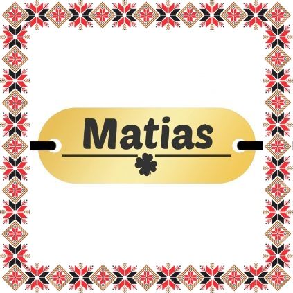 Bratara martisor personalizat prin gravarea pandantivului cu numele Matias si trifoi norocos cu patru foi. Pandantivul - placuta ovala aurie este realizata din otel inoxidabil, un material rezistent ce nu isi modifica culoarea si aspectul in timp iar elasticul este de culoare neagra, aspect ce face din acest martisor un cadou ideal ce poate fi purtat tot anul fiind un accesoriu extrem de versatil, usor de asortat mai multor tinute vestimentare. Dimensiunea bratarii se poate regla prin cele doua noduri culisante, fiind potrivita pentru diferite circumferinte ale mainii. Gravam cu bucurie martisoare special create pentru oamenii dragi din viata ta!