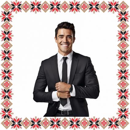 Martisor ambalat pe suport de carton de culoare bej in forma de costum popular romanesc cu motive traditionale.
