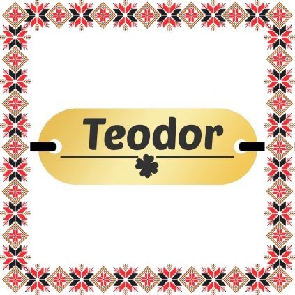 Bratara martisor personalizat prin gravarea pandantivului cu numele Teodor si trifoi norocos cu patru foi. Pandantivul - placuta ovala aurie este realizata din otel inoxidabil, un material rezistent ce nu isi modifica culoarea si aspectul in timp iar elasticul este de culoare neagra, aspect ce face din acest martisor un cadou ideal ce poate fi purtat tot anul fiind un accesoriu extrem de versatil, usor de asortat mai multor tinute vestimentare. Dimensiunea bratarii se poate regla prin cele doua noduri culisante, fiind potrivita pentru diferite circumferinte ale mainii. Gravam cu bucurie martisoare special create pentru oamenii dragi din viata ta!