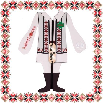 Martisor ambalat pe suport de carton de culoare bej in forma de costum popular romanesc cu motive traditionale.