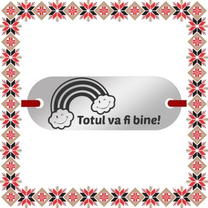 Martisor tip bratara reglabila cu pandantiv gravat cu curcubeu, norisori zambareti si mesajul Totul va fi bine, pe baza placuta ovala de inox de culoare argintie. Un martisor incarcat cu optimism si ganduri bune. Pandantivul este realizat din otel inoxidabil, un material rezistent ce nu isi modifica culoarea si aspectul in timp iar elasticul este de culoare rosie, aspect ce face din acest martisor un accesoriu extrem de versatil, usor de asortat mai multor tinute vestimentare. Dimensiunea bratarii se poate regla prin cele doua noduri culisante, fiind potrivita pentru diferite circumferinte ale mainii. Gravam cu bucurie martisoare special create pentru oamenii dragi din viata ta!