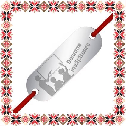Martisor tip bratara reglabila cu pandantiv gravat cu silueta unei profesoare la tabla cu elevii si mesajul Doamna invatatore, pe baza placuta ovala de inox de culoare argintie. Pandantivul este realizat din otel inoxidabil, un material rezistent ce nu isi modifica culoarea si aspectul in timp. Dimensiunea bratarii se poate regla prin cele doua noduri culisante, fiind potrivita pentru diferite circumferinte ale mainii. Gravam cu bucurie martisoare special create pentru oamenii dragi din viata ta!