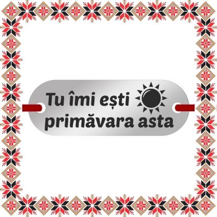 Martisor tip bratara reglabila cu pandantiv gravat cu soare si mesajul Tu imi esti soarele primavara asta, pe baza placuta ovala de inox de culoare argintie. Un martisor cu mesaj cald si bland care o va incanta cu siguranta. Pandantivul este realizat din otel inoxidabil, un material rezistent ce nu isi modifica culoarea si aspectul in timp. Dimensiunea bratarii se poate regla prin cele doua noduri culisante, fiind potrivita pentru diferite circumferinte ale mainii. Gravam cu bucurie martisoare special create pentru oamenii dragi din viata ta!