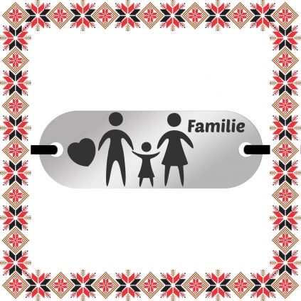 Martisor tip bratara reglabila cu pandantiv gravat cu inima, siluetele unei familii cu o fiica si cuvantul Familie, pe baza placuta ovala de inox de culoare argintie. Un martisor pe care un familist il va aprecia enorm, daruieste-l cu incredere. Pandantivul este realizat din otel inoxidabil, un material rezistent ce nu isi modifica culoarea si aspectul in timp. Dimensiunea bratarii se poate regla prin cele doua noduri culisante, fiind potrivita pentru diferite circumferinte ale mainii. Gravam cu bucurie martisoare special create pentru oamenii dragi din viata ta!