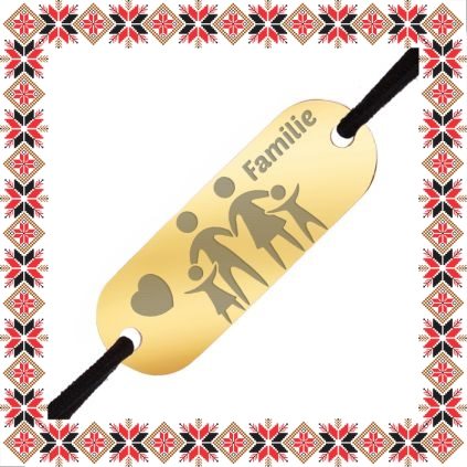 Martisor tip bratara reglabila cu pandantiv gravat cu inima, siluetele unei familii cu o fiica si un fiu si cuvantul Familie, pe baza placuta ovala de inox de culoare aurie. Un martisor pe care un familist il va aprecia enorm, daruieste-l cu incredere. Pandantivul este realizat din otel inoxidabil, un material rezistent ce nu isi modifica culoarea si aspectul in timp. Dimensiunea bratarii se poate regla prin cele doua noduri culisante, fiind potrivita pentru diferite circumferinte ale mainii. Gravam cu bucurie martisoare special create pentru oamenii dragi din viata ta!