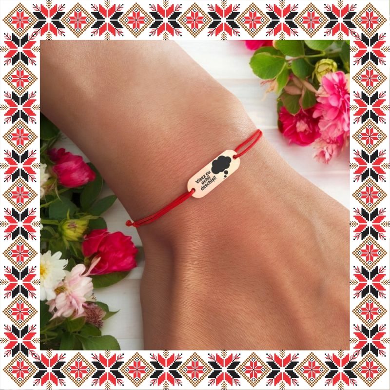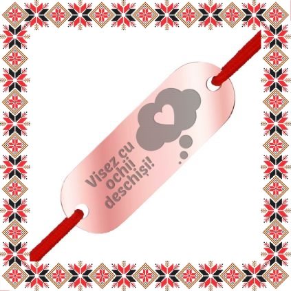 Martisor tip bratara reglabila cu pandantiv gravat cu norisor cu inima si mesajul Visez cu ochii deschisi, pe baza placuta ovala de inox de culoare rose gold. Un martisor potrivit doamnelor vesele si visatoare, mereu cu zambetul pe buze si ganduri bune. Pandantivul este realizat din otel inoxidabil, un material rezistent ce nu isi modifica culoarea si aspectul in timp iar elasticul este de culoare rosie. Dimensiunea bratarii se poate regla prin cele doua noduri culisante, fiind potrivita pentru diferite circumferinte ale mainii. Gravam cu bucurie martisoare special create pentru oamenii dragi din viata ta!