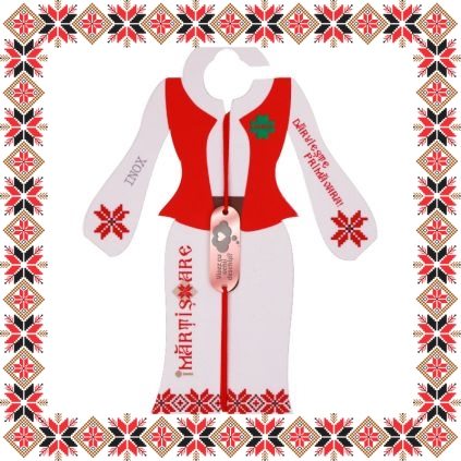 Martisor ambalat pe suport de carton de culoare bej in forma de costum popular romanesc cu motive traditionale. Snur de martisor si plic de hartie imprimat cu motive traditionale romanesti CADOU!