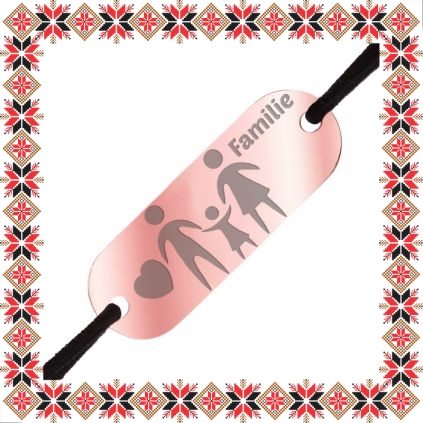 Martisor tip bratara reglabila cu pandantiv gravat cu inima, siluetele unei familii cu o fiica si cuvantul Familie, pe baza placuta ovala de inox de culoare rose gold. Un martisor pe care un familist il va aprecia enorm, daruieste-l cu incredere. Pandantivul este realizat din otel inoxidabil, un material rezistent ce nu isi modifica culoarea si aspectul in timp. Dimensiunea bratarii se poate regla prin cele doua noduri culisante, fiind potrivita pentru diferite circumferinte ale mainii. Gravam cu bucurie martisoare special create pentru oamenii dragi din viata ta!