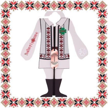 Martisor ambalat pe suport de carton de culoare bej in forma de costum popular romanesc cu motive traditionale. Snur de martisor si plic de hartie imprimat cu motive traditionale romanesti CADOU!