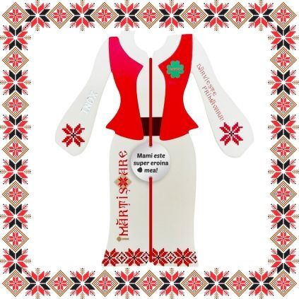 Martisor ambalat pe suport de carton de culoare bej in forma de costum popular romanesc cu motive traditionale.