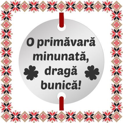 Martisor tip bratara reglabila cu pandantiv gravat cu trifoi cu patru foi si mesajul O primavara minunata, draga bunica, pe baza in forma de banut rotund de inox de culoare argintie. Pandantivul este realizat din otel inoxidabil, un material rezistent ce nu isi modifica culoarea si aspectul in timp iar elasticul este de culoare rosie. Dimensiunea bratarii se poate regla prin cele doua noduri culisante, fiind potrivita pentru diferite circumferinte ale mainii. Gravam cu bucurie martisoare special create pentru oamenii dragi din viata ta!