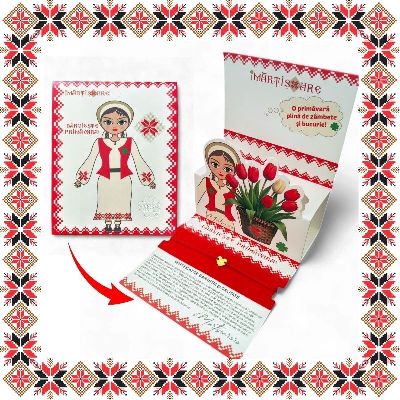 Martisor ambalat premium pe suport de carton tip felicitare 3D de culoare bej cu catifea rosie, tematica inspirata din folclor si stil prietenos, design traditional reinterpretat modern. Snur de martisor si plic de hartie imprimat cu motive traditionale romanesti CADOU!