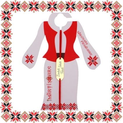 Martisor ambalat pe suport de carton de culoare bej in forma de costum popular romanesc cu motive traditionale si mesajul Daruieste primavara. Snur de martisor si plic de hartie imprimat cu motive traditionale romanesti CADOU!