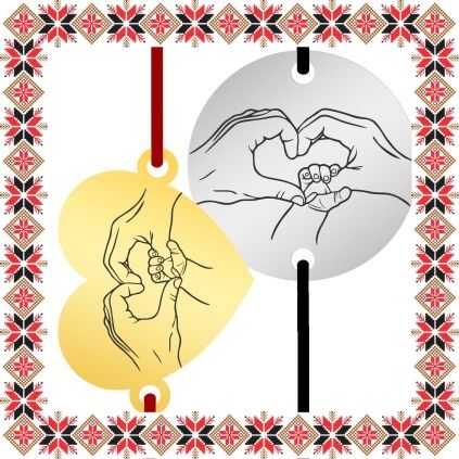 Set 2 martisoare tip bratari reglabile cu pandantive gravate cu mainile parintilor si a bebelusului lor, pe baza in forma de inima aurie si banut argintiu realizate din inox. Pandantivele sunt realizate din otel inoxidabil, un material rezistent ce nu isi modifica culoarea si aspectul in timp iar elasticul este de culoare rosie si neagra, aspect ce face din aceste martisoare niste accesorii extrem de versatile, usor de asortat mai multor tinute vestimentare. Dimensiunea bratarilor se poate regla prin cele doua noduri culisante, fiind potrivita pentru diferite circumferinte ale mainii. Gravam cu bucurie martisoare special create pentru oamenii dragi din viata ta!