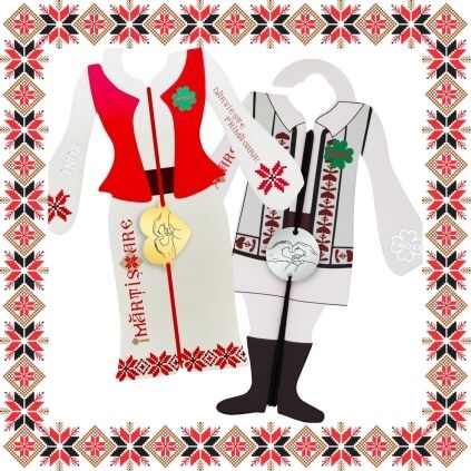Martisoare ambalate pe suport de carton de culoare bej in forma de costum popular romanesc cu motive traditionale.