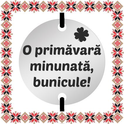 Martisor tip bratara reglabila cu pandantiv gravat cu trifoi cu patru foi si mesajul O primavara minunata bunicule, pe baza in forma de banut rotund de inox de culoare argintie. Pandantivul este realizat din otel inoxidabil, un material rezistent ce nu isi modifica culoarea si aspectul in timp. Dimensiunea bratarii se poate regla prin cele doua noduri culisante, fiind potrivita pentru diferite circumferinte ale mainii. Gravam cu bucurie martisoare special create pentru oamenii dragi din viata ta!