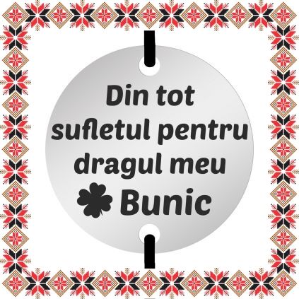 Martisor tip bratara reglabila cu pandantiv gravat cu trifoi cu patru foi si mesajul Din tot sufletul pentru dragul meu bunic, pe baza in forma de banut rotund de inox de culoare argintie. Pandantivul este realizat din otel inoxidabil, un material rezistent ce nu isi modifica culoarea si aspectul in timp iar elasticul este de culoare neagra, aspect ce face din acest martisor un accesoriu extrem de versatil, usor de asortat mai multor tinute vestimentare. Dimensiunea bratarii se poate regla prin cele doua noduri culisante, fiind potrivita pentru diferite circumferinte ale mainii. Gravam cu bucurie martisoare special create pentru oamenii dragi din viata ta!
