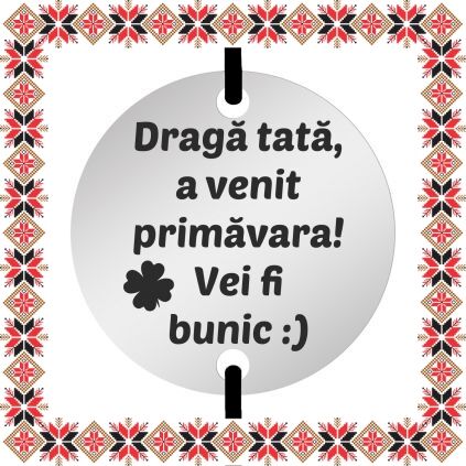 Martisor tip bratara reglabila cu pandantiv gravat cu trifoi cu patru foi si mesajul Draga tata, a venit primavara, vei fi bunic, pe baza in forma de banut rotund de inox de culoare argintie. Pandantivul este realizat din otel inoxidabil, un material rezistent ce nu isi modifica culoarea si aspectul in timp iar elasticul este de culoare neagra, aspect ce face din acest martisor un accesoriu extrem de versatil, usor de asortat mai multor tinute vestimentare. Dimensiunea bratarii se poate regla prin cele doua noduri culisante, fiind potrivita pentru diferite circumferinte ale mainii. Gravam cu bucurie martisoare special create pentru oamenii dragi din viata ta!