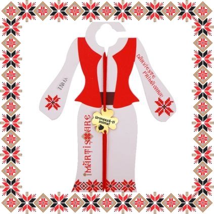 Martisor ambalat pe suport de carton de culoare bej in forma de costum popular romanesc cu motive traditionale. Snur de martisor si plic de hartie imprimat cu motive traditionale romanesti CADOU!