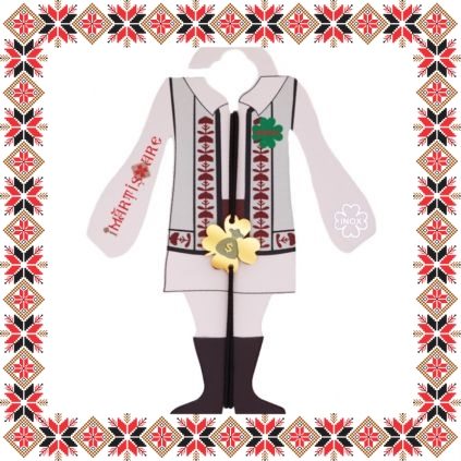 Martisor ambalat pe suport de carton de culoare bej in forma de costum popular romanesc cu motive traditionale. Snur de martisor si plic de hartie imprimat cu motive traditionale romanesti CADOU!