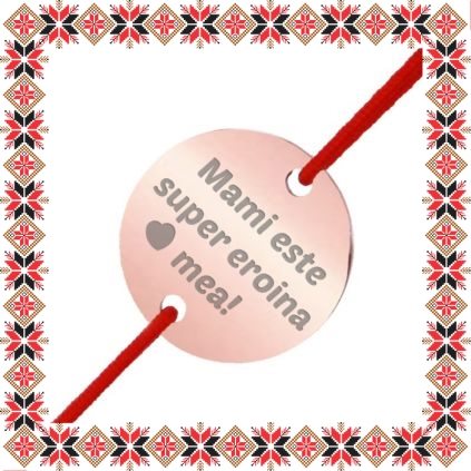 Martisor tip bratara reglabila cu pandantiv gravat cu inimioara si mesajul Mami este super eroina mea, pe baza in forma de banut rotund de inox de culoare rose gold. Un martisor creat special pentru mamici. Pandantivul este realizat din otel inoxidabil, un material rezistent ce nu isi modifica culoarea si aspectul in timp iar elasticul este de culoare rosie. Dimensiunea bratarii se poate regla prin cele doua noduri culisante, fiind potrivita pentru diferite circumferinte ale mainii. Gravam cu bucurie martisoare special create pentru oamenii dragi din viata ta!