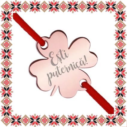 Martisor tip bratara reglabila cu pandantiv gravat cu mesajul Esti puternica, pe baza in forma de trifoi de inox de culoare rose gold. Un martisor potrivit atunci cand vrei sa isi aminteasca ca este puternica si curajoasa. Pandantivul este realizat din otel inoxidabil, un material rezistent ce nu isi modifica culoarea si aspectul in timp iar elasticul este de culoare rosie, aspect ce face din acest martisor un accesoriu extrem de versatil, usor de asortat mai multor tinute vestimentare. Dimensiunea bratarii se poate regla prin cele doua noduri culisante, fiind potrivita pentru diferite circumferinte ale mainii. Gravam cu bucurie martisoare special create pentru oamenii dragi din viata ta!