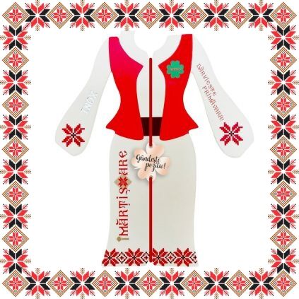 Martisor ambalat pe suport de carton de culoare bej in forma de costum popular romanesc cu motive traditionale.