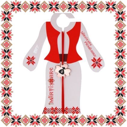 Martisor ambalat pe suport de carton de culoare bej in forma de costum popular romanesc cu motive traditionale. Snur de martisor si plic de hartie imprimat cu motive traditionale romanesti CADOU!
