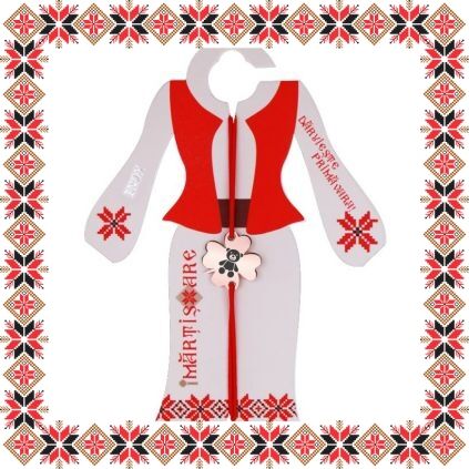 Martisor ambalat pe suport de carton de culoare bej in forma de costum popular romanesc cu motive traditionale.