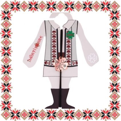 Martisor ambalat pe suport de carton de culoare bej in forma de costum popular romanesc cu motive traditionale. Snur de martisor si plic de hartie imprimat cu motive traditionale romanesti CADOU!