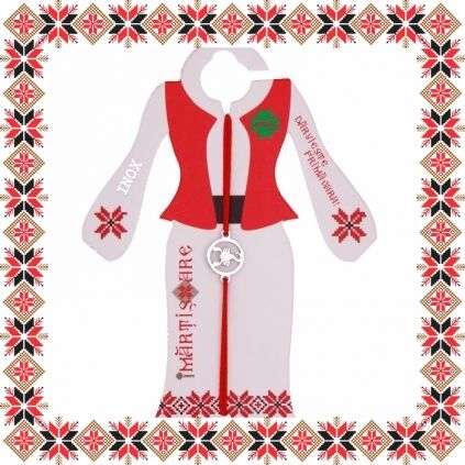 Martisor ambalat pe suport de carton de culoare bej in forma de costum popular romanesc cu motive traditionale si mesajul Daruieste primavara.